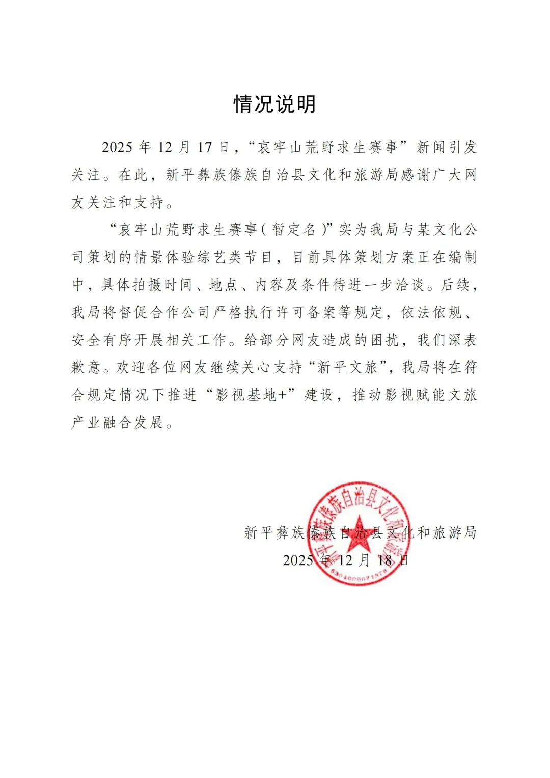 情況說明稱,“哀牢山荒野求生賽事(暫定名)”實為新平彝族傣族自治縣文化和旅游局與某文化公司策劃的情景體驗綜藝類節目,目前具體策劃方案正在編制中,具體拍攝時間、地點、內容及條件待進一步洽談。后續新平彝族傣族自治縣文化和旅游局將督促合作公司嚴格執行許可備案等規定,依法依規、安全有序開展相關工作。