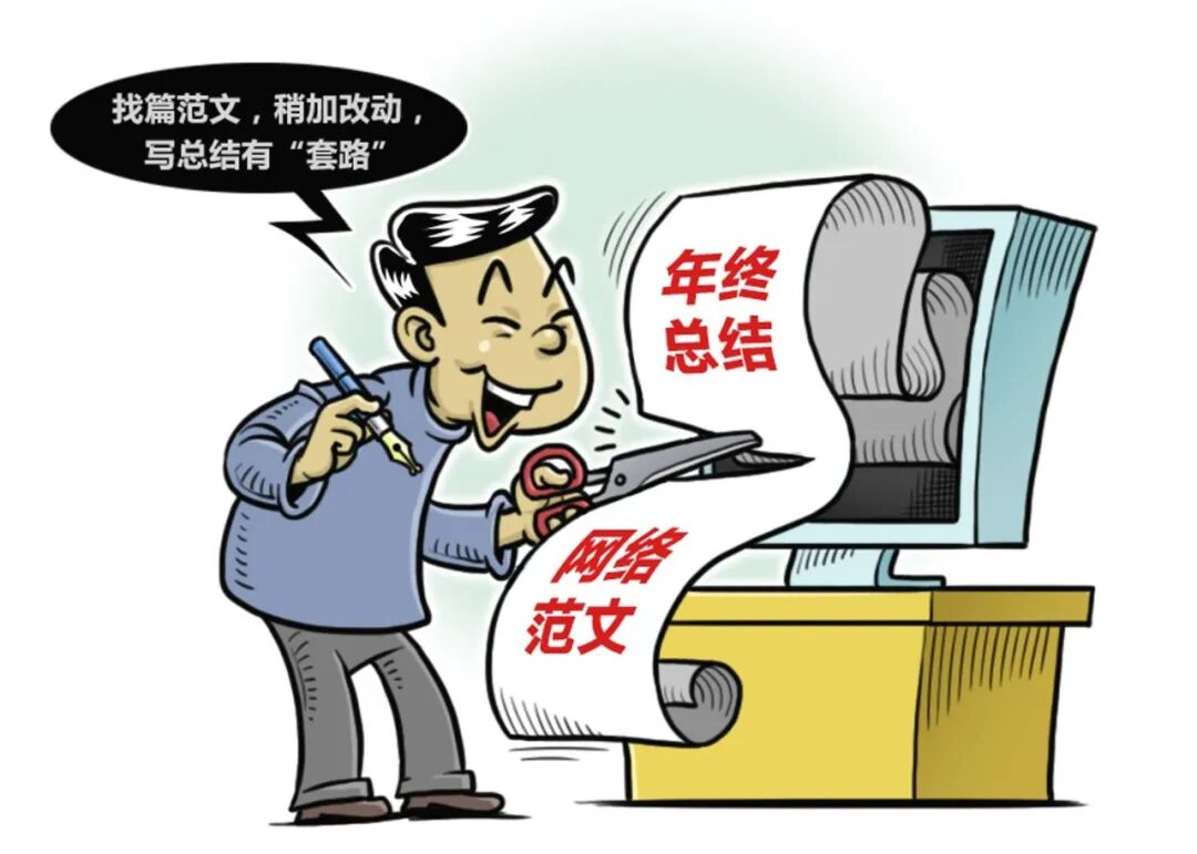 有些人圖省事、怕麻煩,打開往年的總結(jié),改改時間、換換數(shù)據(jù);有些人找來兄弟單位范文,換個單位名稱,簡單修改就算完工;有些人直接從網(wǎng)上下載模板,東拼西湊、生搬硬套,寫的內(nèi)容大同小異,“蓋住名字都一樣”。