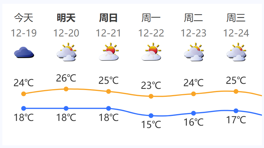 12月19日,陰天間多云,有分散小雨;氣溫18℃—24℃;東風2—3級;相對濕度60%—90%。