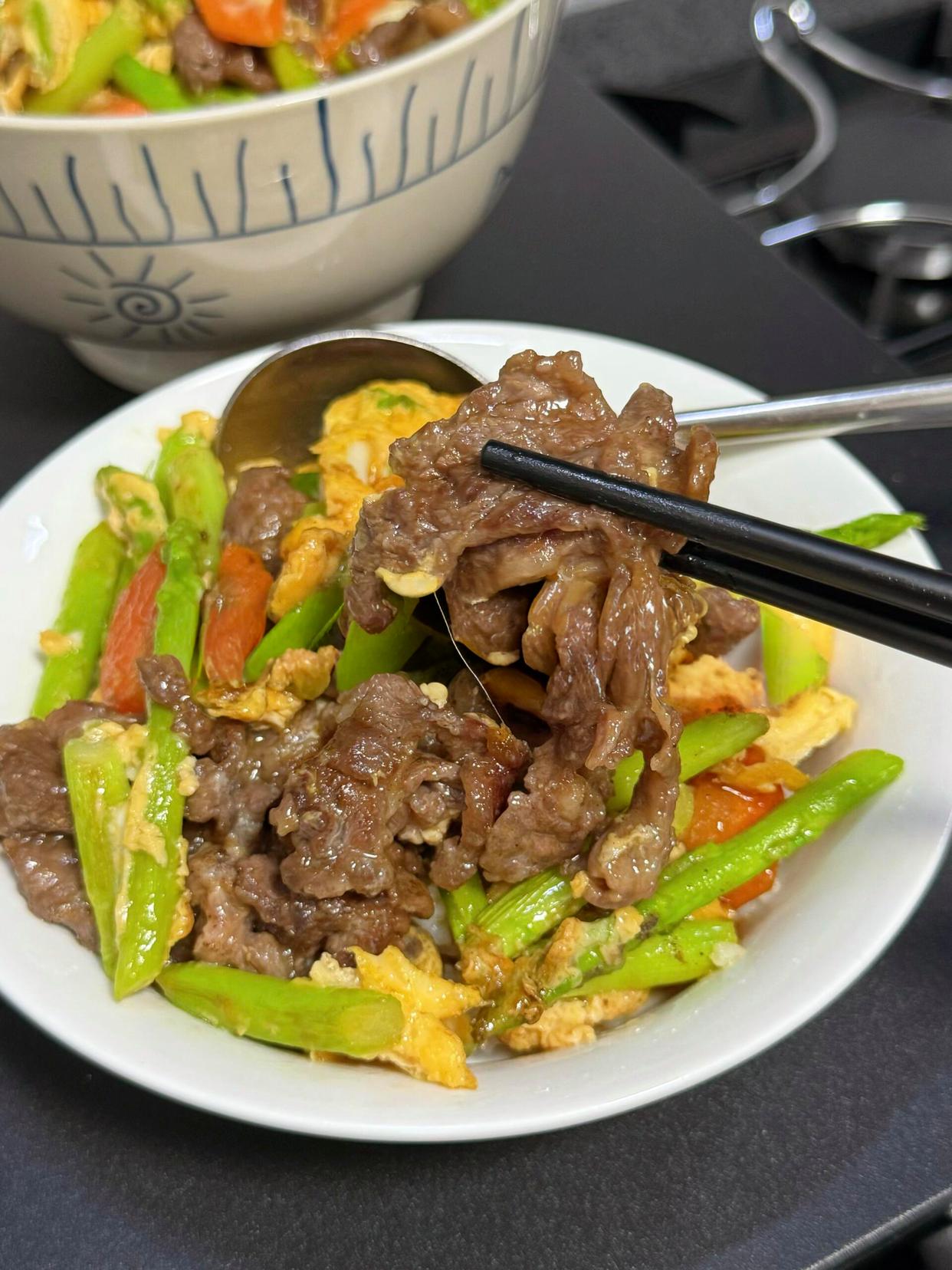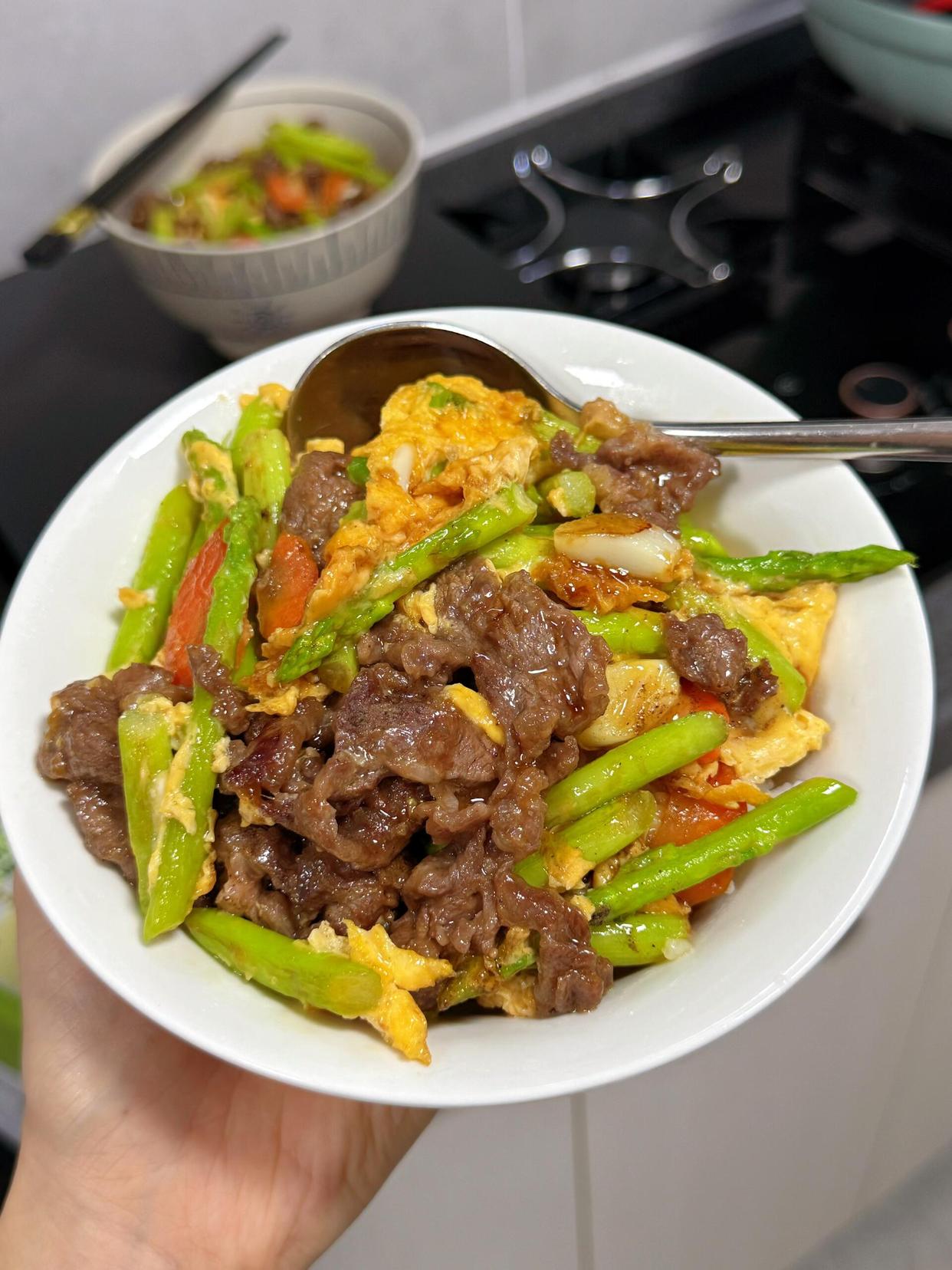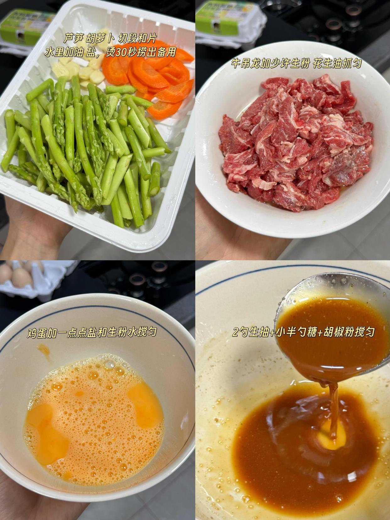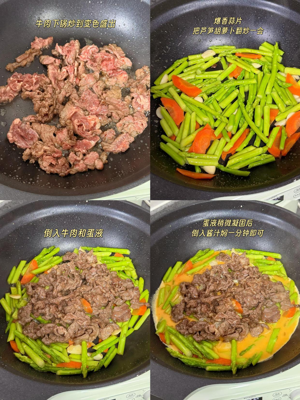 4. 蘆筍胡蘿卜炒雞蛋牛肉——鮮香下飯,營養(yǎng)均衡