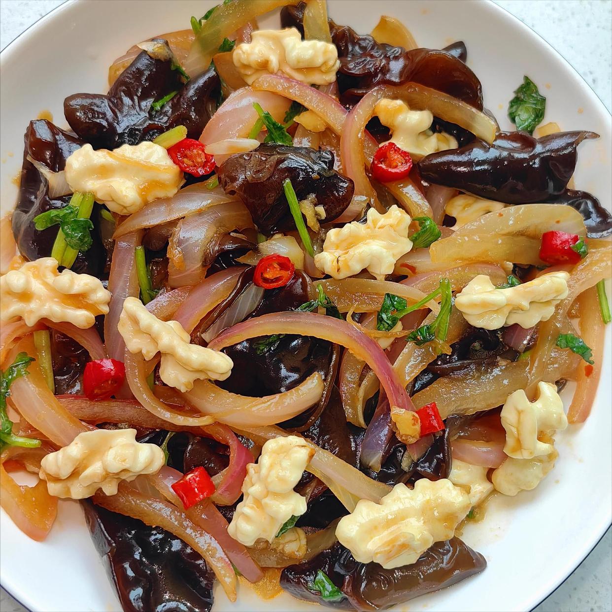 核桃的香脆搭配木耳的脆嫩,涼拌后清爽可口、低脂健康,既能護心,又能促進腸道蠕動,熟吃養胃效果好,作為配菜或加餐都合適,解膩又養生。
