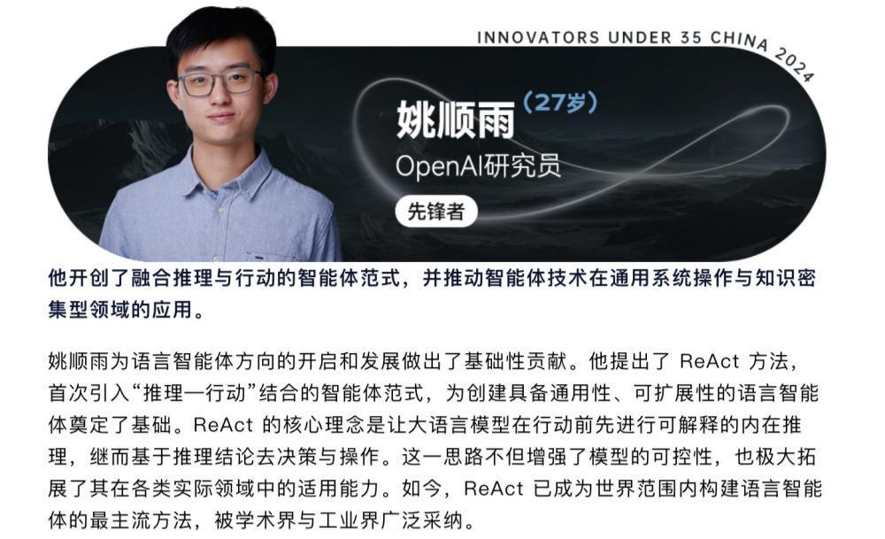 2024年博士畢業(yè)后,姚順雨加入OpenAI擔(dān)任研究科學(xué)家,深度參與智能體產(chǎn)品Operator、DeepResearch及計(jì)算機(jī)使用智能體(CUA)的核心研發(fā),為語(yǔ)言智能體領(lǐng)域的發(fā)展奠定基礎(chǔ)。