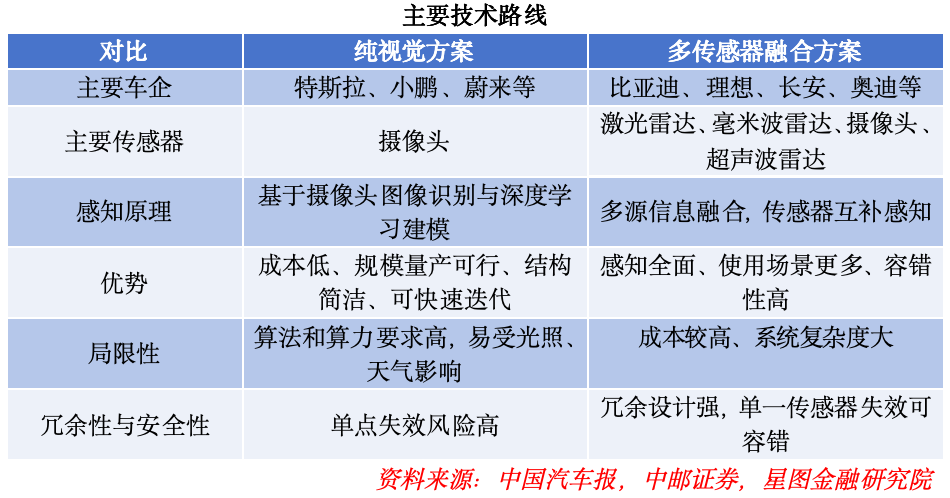 當前智能駕駛技術主要分為兩大技術路線。一是以特斯拉、小鵬為代表的純視覺方案,其主要依賴攝像頭,通過圖像識別與深度學習建模實現環境感知,兼具成本優勢與快速迭代能力,但對算法、算力要求較高,且易受光照、天氣等外部環境影響;二是以比亞迪、理想、奧迪等車企為代表的多傳感器融合方案,整合激光雷達、毫米波雷達、攝像頭、超聲波雷達等多類設備,基于多源信息融合與傳感器互補感知,具備感知全面、適用場景更廣、容錯性強等優勢,但存在成本較高、系統復雜度大的特點。