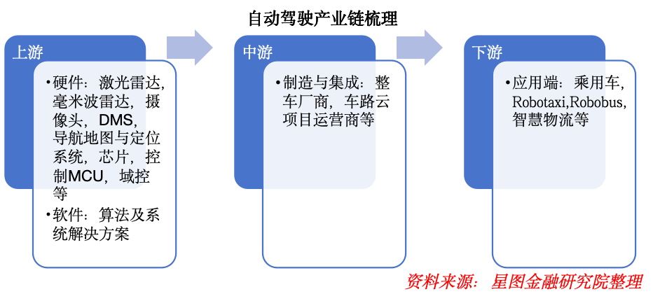 上游聚焦激光雷達、毫米波雷達、高清攝像頭等感知傳感器、車載芯片、高精地圖、核心算法等核心軟硬件。