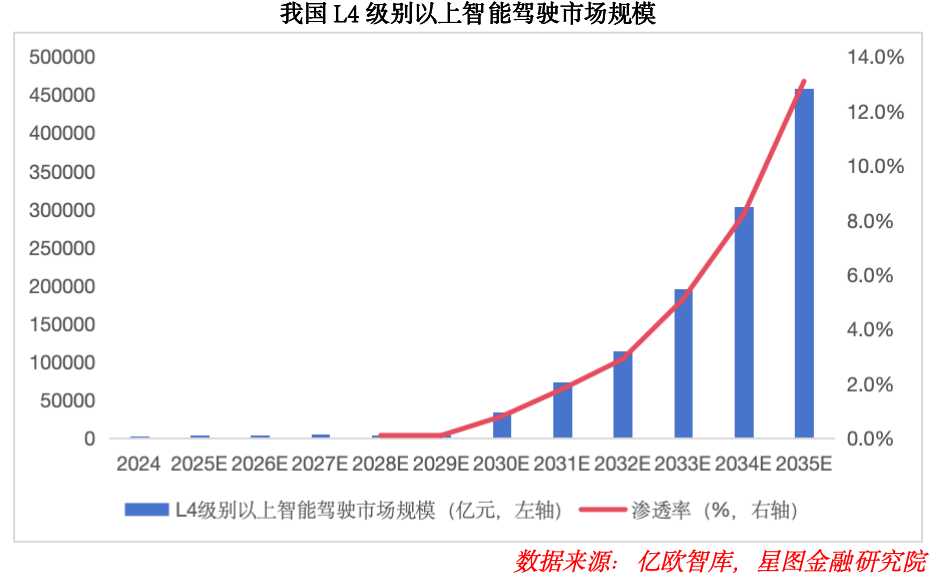 對于整體市場而言,萬億級賽道正加速成型。根據億歐智庫,2024年我國L4級別智能駕駛行業規模已達241億元,隨著商業化逐步落地,行業將開啟三波增長浪潮。首先是港口、園區、倉儲、城區末端等中低速場景有望率先爆發;第二波預計在2027年至2031年,Robotaxi/Robobus與干線物流等中高速場景有望解鎖,催生大規模商業落地;2032年之后,跨場景聯動運營網絡或將逐步成型,帶來第三波落地浪潮。到2035年,我國L4級高階智能駕駛市場規模有望突破45萬億元,L4級別以上智能駕駛滲透率將達到13%。