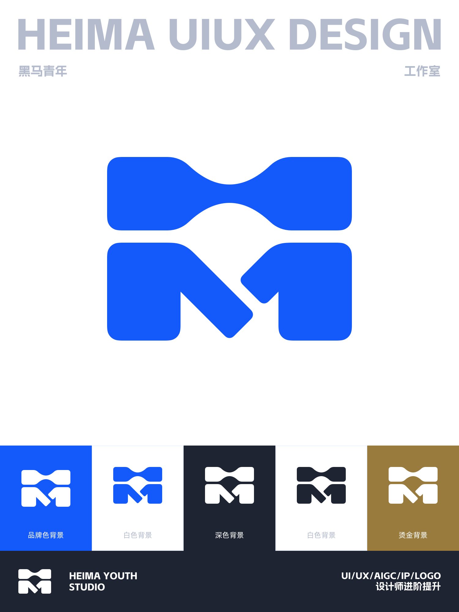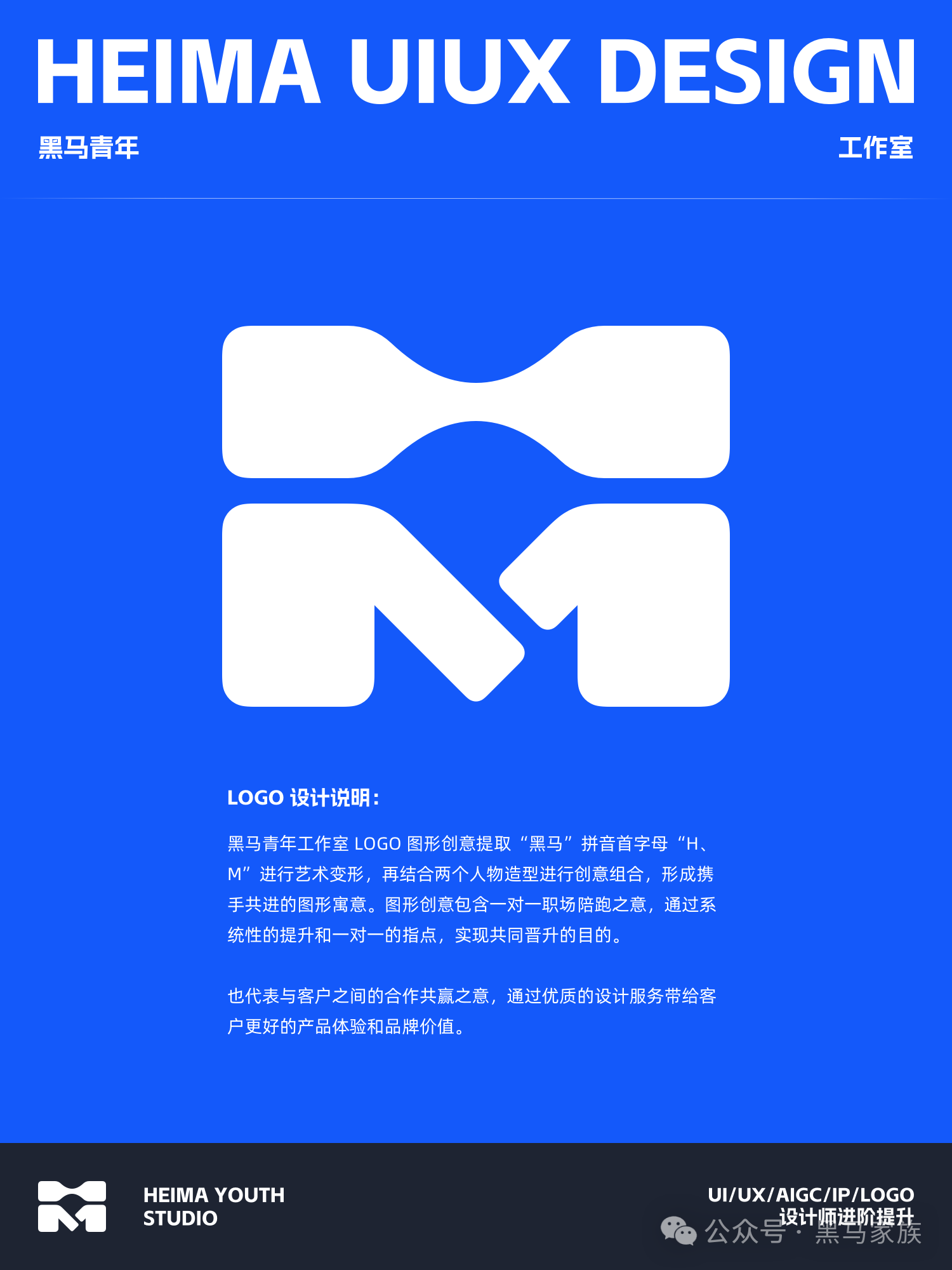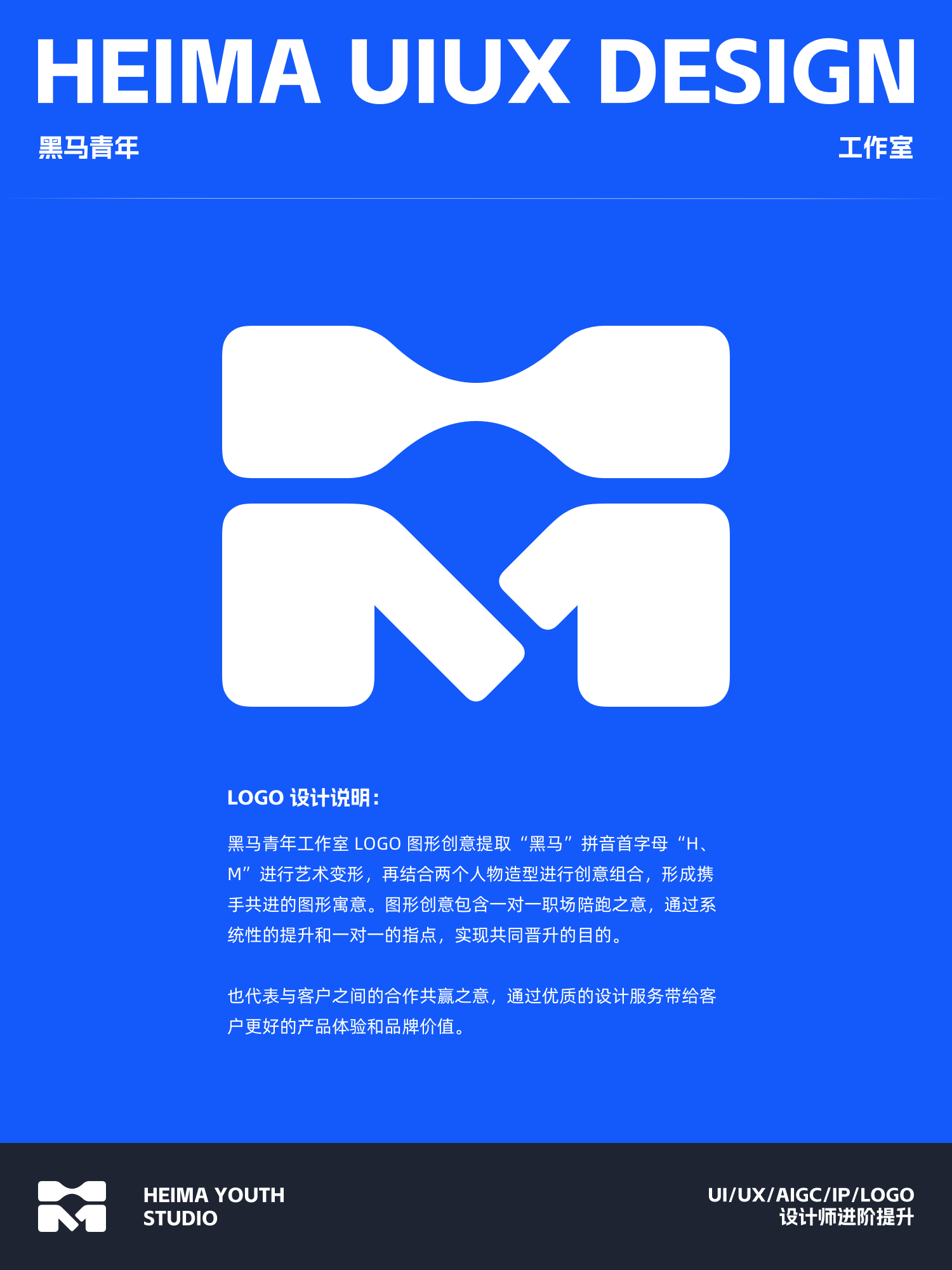 LOGO 設計說明:黑馬青年工作室 LOGO 圖形創意提取“黑馬”拼音首字母“H、M”進行藝術變形,再結合兩個人物造型進行創意組合,形成攜手共進的圖形寓意。圖形創意包含一對一職場陪跑之意,通過系統性的提升和一對一的指點,實現共同晉升的目的。