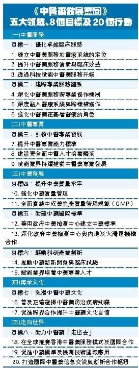 他表示,《藍圖》是政府首份針對中醫藥發展而公布的政策文件,內容涵蓋五大領域,並提出八大目標及20個行動(詳見列表),從而實現香港中醫藥發展的一個願景,願景就是傳承精華,守正創新,背靠國家發展的經驗和資源,利用中醫藥讓香港市民享有更優質及更全面的醫療服務,從而提升健康水平。同時要建設香港成為中醫及中藥走向世界的橋頭堡。