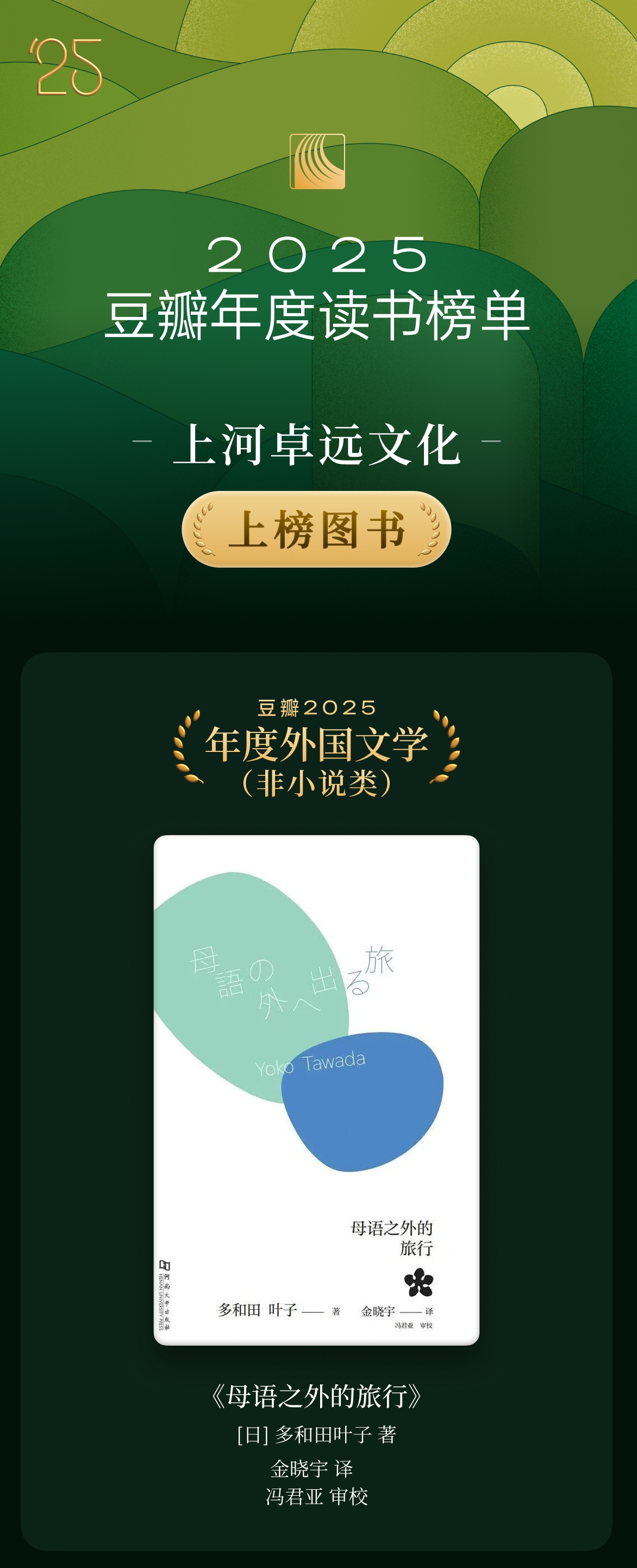 12月18日,備受矚目的豆瓣2025年度讀書榜單新鮮出爐,河南大學(xué)出版社·上河卓遠(yuǎn)文化出版的《母語之外的旅行》入選“2025豆瓣年度讀書外國文學(xué)(非小說類)”榜單。