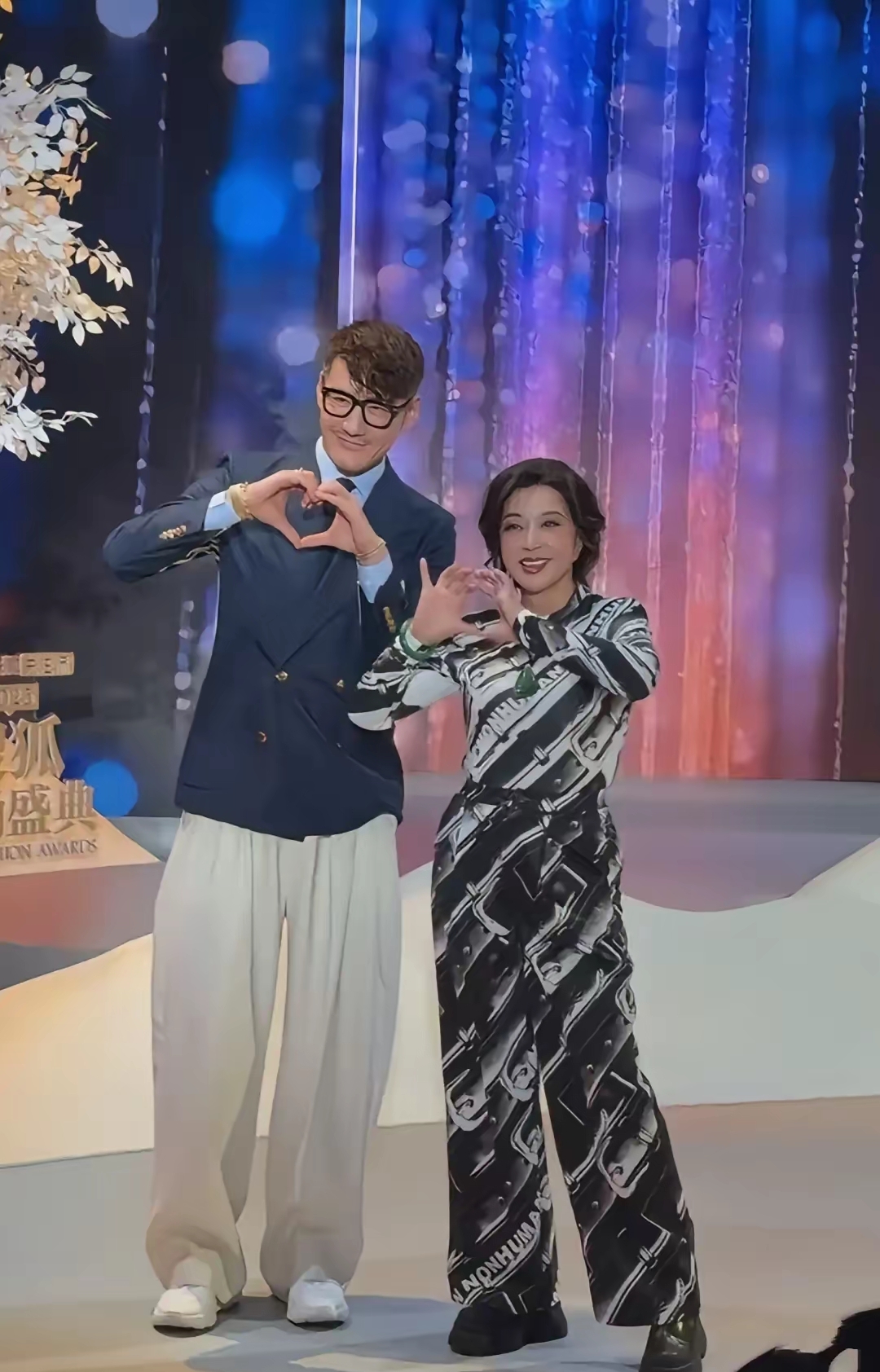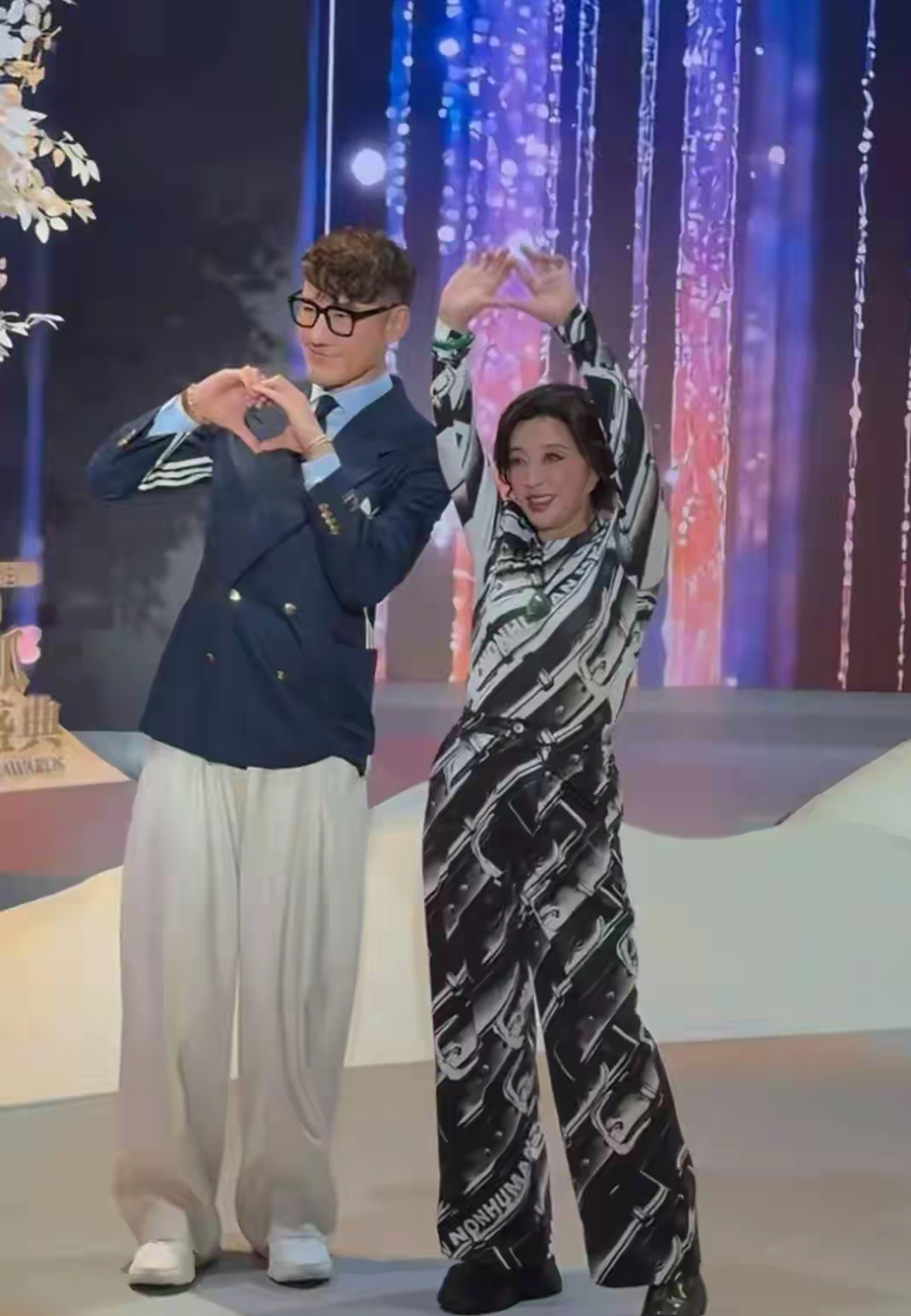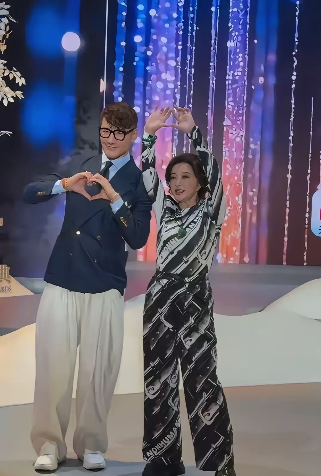 鏡頭下,二人在臺上雙手比愛心的動作,更是顯得可愛,真沒想到二人組合竟然如此美麗,這二人也不知道是襯托了誰,反正看起來比以往好看,尤其是劉曉慶看起來真的是逆齡成長!