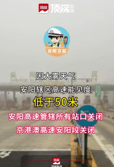 因大霧天氣,安陽轄區(qū)高速公路能見度低于50米,轄區(qū)內(nèi)所有高速公路站口關(guān)閉,京港澳高速公路安陽段關(guān)閉。請(qǐng)公眾及時(shí)調(diào)整出行計(jì)劃,解封時(shí)間視天氣和路況而定。