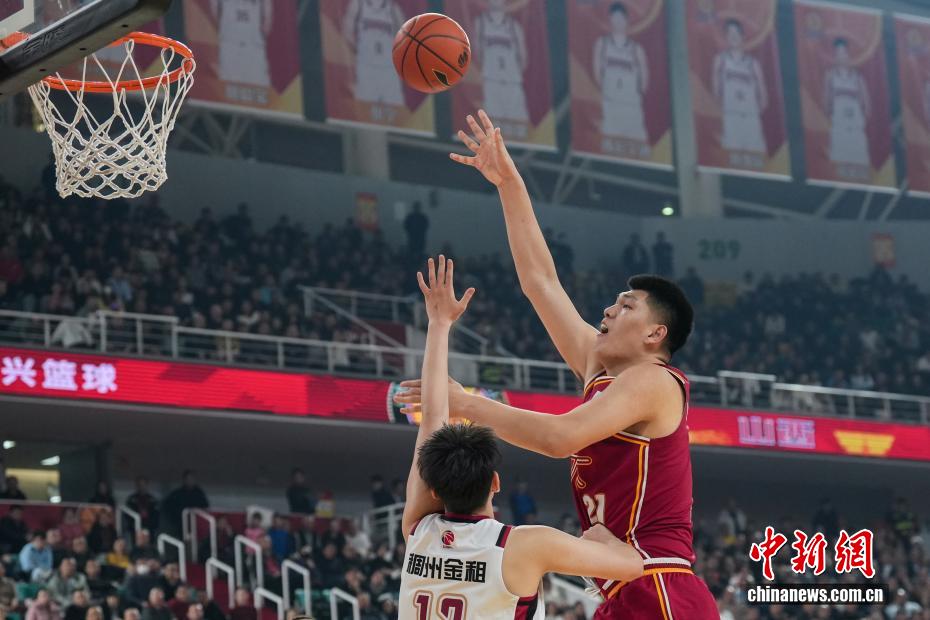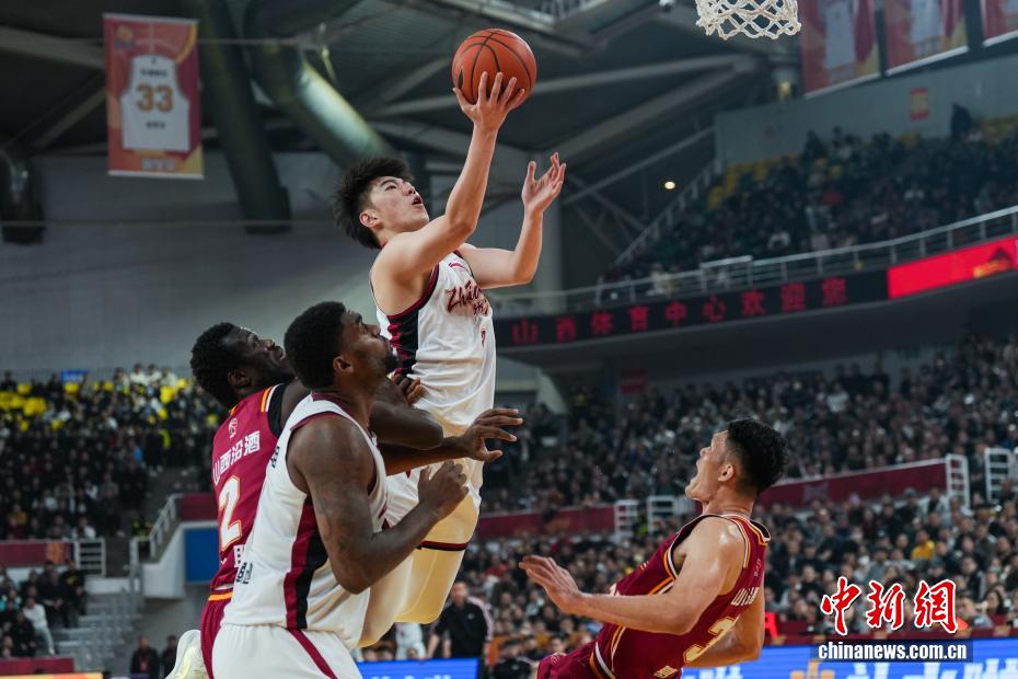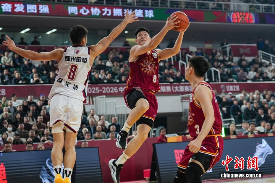 12月18日,山西隊球員賈明儒(紅)在比賽中投籃。當日,在太原進行的2025-2026賽季中國男子籃球職業聯賽(CBA)常規賽第3輪比賽中,山西汾酒隊主場以102比91戰勝浙江稠州金租隊。