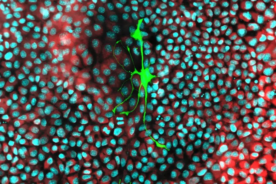 在癌細(xì)胞培養(yǎng)物中生長(zhǎng)的神經(jīng)細(xì)胞(染成了綠色)。圖片來源:英國(guó)《新科學(xué)家》網(wǎng)站