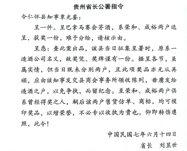 由于當(dāng)時(shí)送展情況特殊,"由于當(dāng)時(shí)農(nóng)工部送酒參展時(shí)未加以區(qū)分",產(chǎn)品獲獎后金牌歸誰,兩家傾力相爭。直至1918年,這場爭議終于有了結(jié)果。"時(shí)任貴州省省長劉顯世裁決:成裕、榮和兩家均可享受金獎榮譽(yù),用作宣傳,獎牌及證書則由仁懷商會收藏陳列"。