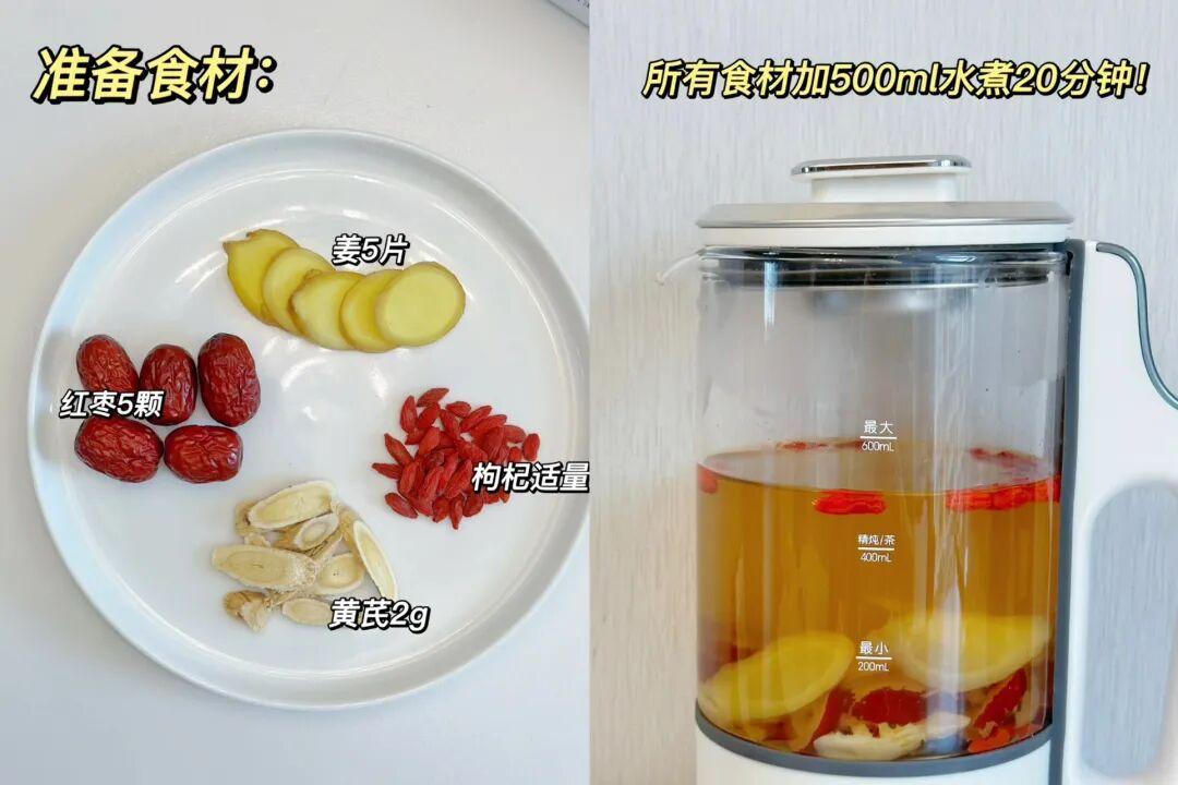 現在年輕人壓力總是很大,像我們經常坐辦公室的人久坐就會出現身體乏力,沒氣血的情況。為了不變成黃臉婆,氣血可得補起來。這道黃芪紅棗枸杞茶就挺不錯的,黃芪補氣,紅棗枸杞養顏補血,一天喝一杯,能補充氣血,還能緩解久坐后的身體乏力。很適合沒時間煲湯的辦公族,在辦公室用養生壺就可以煮。