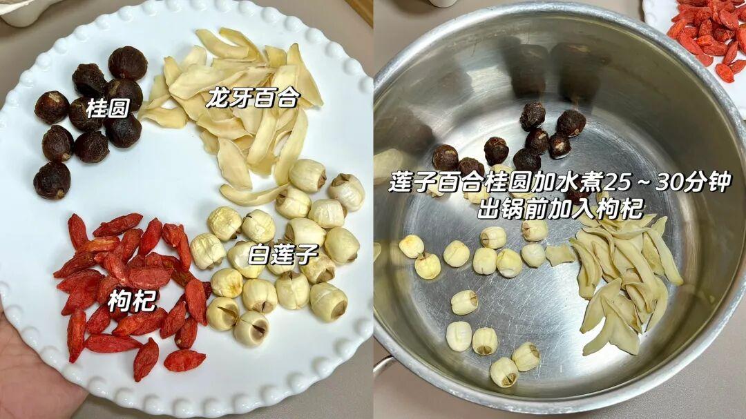 1. 蓮子、百合提前用清水泡發30分鐘,桂圓去殼,枸杞洗凈備用;