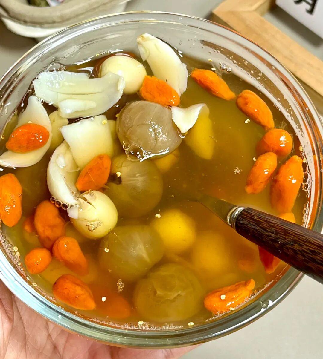 最近老公壓力比較大,每天熬夜加班到很晚,睡覺也睡不踏實,總是想著工作的事。我給老公做了這個蓮子百合桂圓湯,沒想到喝了幾次,睡覺踏實了,白天氣色也好多了。桂圓和枸杞補氣血,蓮子百合安神,這道湯喝起來甜絲絲的,清爽不膩,既能補足氣血,還能改善秋冬失眠,心煩意亂、白天乏力的情況。