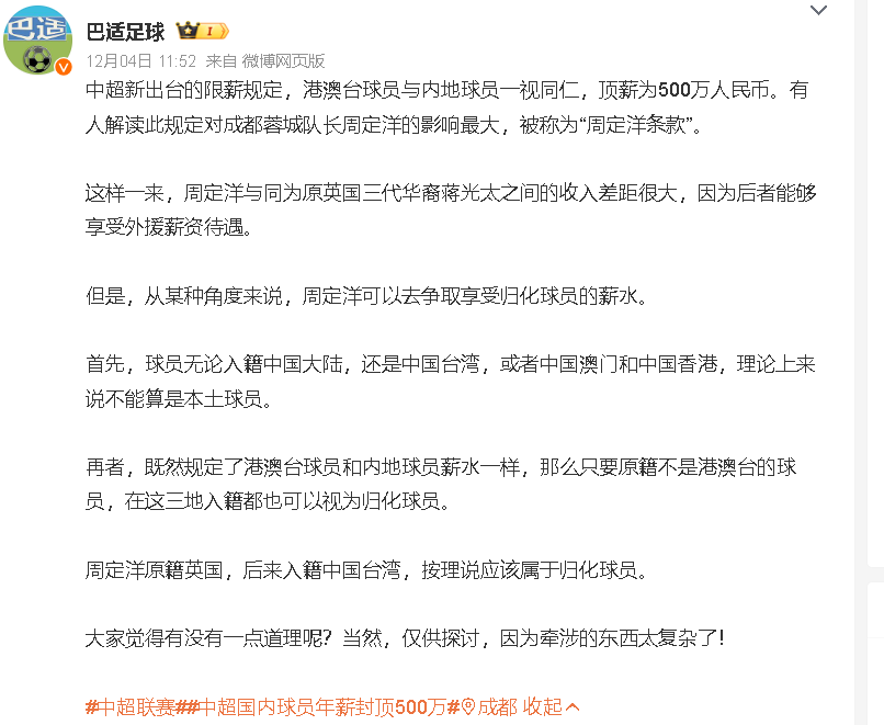 最近中國足球職業聯賽聯合會一紙《財務約定指標》文件,徹底攪動了中超的薪資江湖。國內球員頂薪500萬、外援300萬歐元、入籍球員可按外援標準執行,這場“限薪風暴”看似雨露均沾,實則暗藏玄機,有人歡喜有人愁,而最尷尬的,莫過于那些拿著中國護照的入籍球員,以及像周定洋這樣“身份特殊”的港澳臺球員,如何看這個問題?#2025新星計劃4期##創作挑戰賽十一期##2025頂端人氣創作者 #