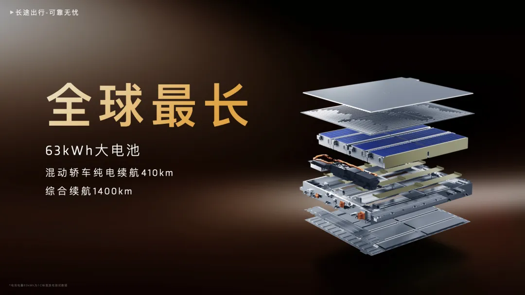 動(dòng)力方面,新車搭載110kW 1.5T發(fā)動(dòng)機(jī)+單擋變速箱+380kW雙電機(jī)組成的插電式混合動(dòng)力系統(tǒng),匹配63kWh三元鋰電池,CLTC純電續(xù)航410km,WLTC百公里饋電油耗5.67L/100km。