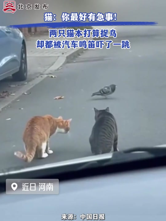 貓:你最好有急事!兩只貓本打算捉鳥卻都被汽車鳴笛嚇了一跳