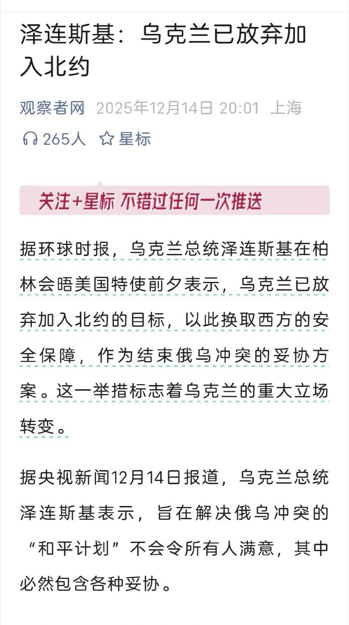 澤連斯基宣布:烏克蘭已放棄加入北約。非常可惜,這個決定遲到了近四年。 ???