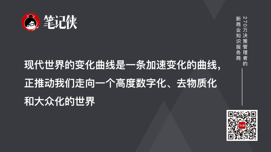現代世界的變化曲線是一條加速變化的曲線,正推動我們走向一個高度數字化、去物質化和大眾化的世界,這通常是通過計算和高速網絡來實現的。有兩點特別值得注意。