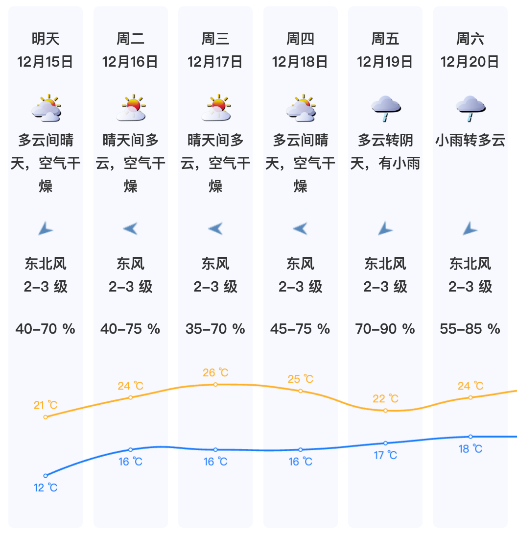 周二至周四(12月16日—18日)多云間晴天,氣溫回升,白天舒適,早晚清涼;