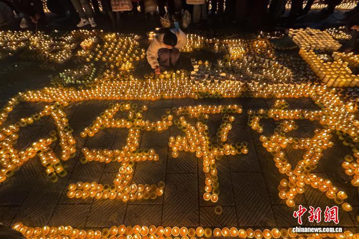 12月14日,塔爾寺燃燈日現場的“眾生平安”字樣燈陣。中新社記者 陳宗淇 攝