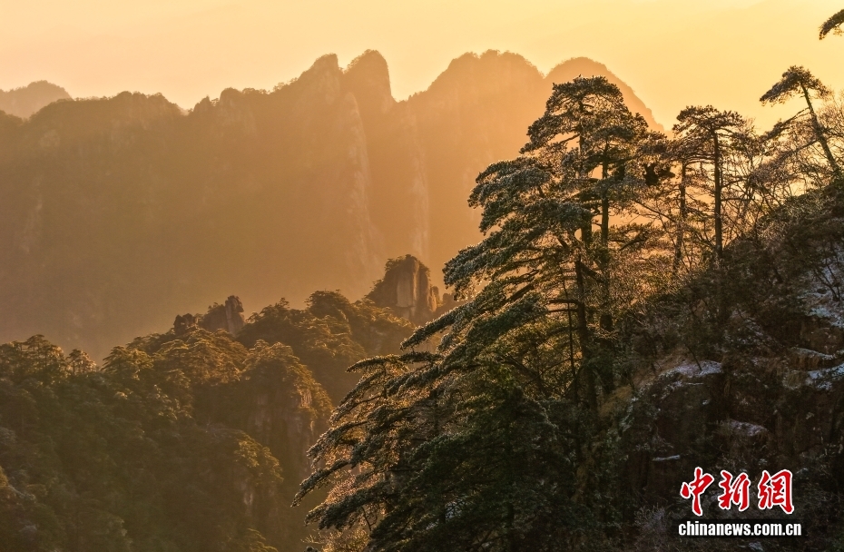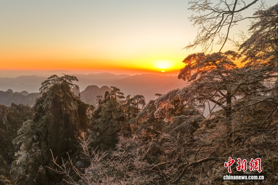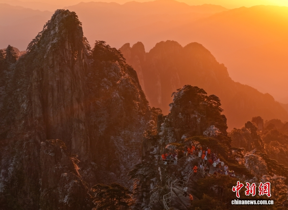 12月14日,雪后初霽的黃山風(fēng)景區(qū),絢麗日出與奇松、怪石交相映襯,熠熠生輝,吸引眾多游客前來(lái)賞雪觀景。