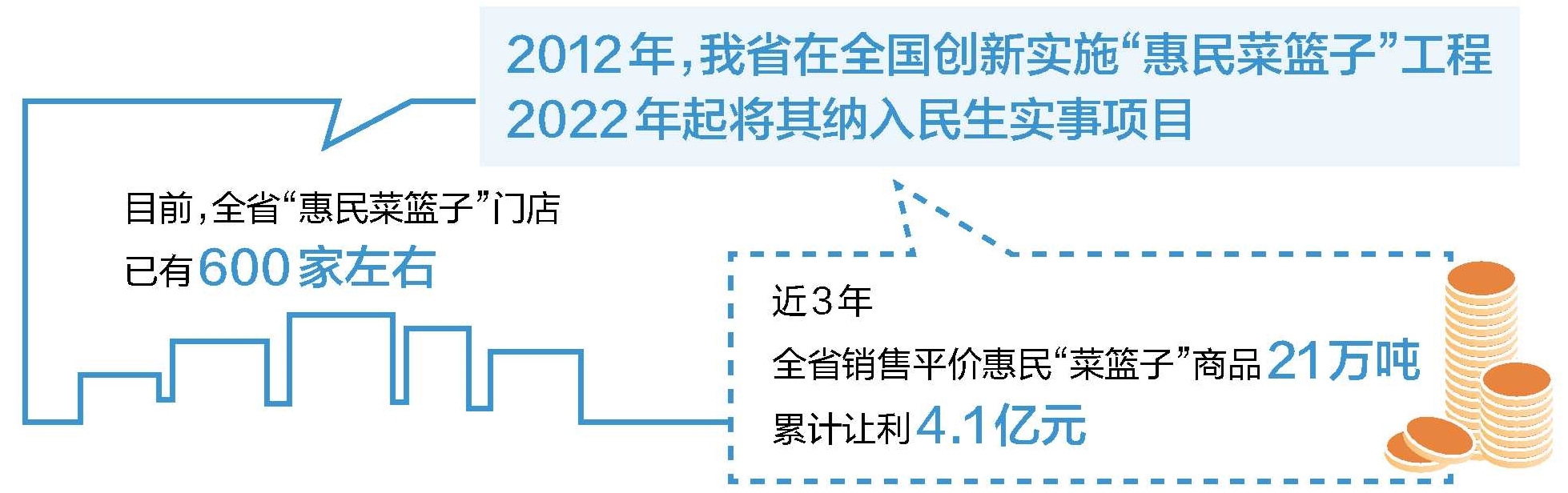 2012年,我省在全國創(chuàng)新實施“惠民菜籃子”工程,2022年起將其納入民生實事項目。目前全省“惠民菜籃子”門店已有600家左右,在各市城區(qū)主要社區(qū)基本實現(xiàn)“全覆蓋”。近3年全省銷售平價惠民“菜籃子”商品21萬噸,累計讓利達4.1億元。在主要節(jié)假日、突發(fā)事件及菜價上漲時,“惠民菜籃子”總會如約而至,為群眾帶來“穩(wěn)穩(wěn)的幸福”。