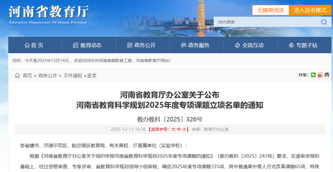 河南省教育廳辦公室關于公布河南省教育科學規劃2025年度專項課題立項名單的通知