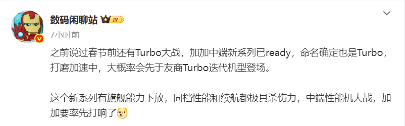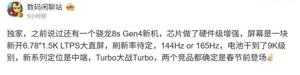 其實(shí)此前該博主就曾爆料過一款Turbo新機(jī),據(jù)其稱該機(jī)將搭載驍龍8s Gen4處理器,并且做了硬件級(jí)的增強(qiáng),屏幕方面采用1.5K分辨率6.78英寸LTPS大直屏,當(dāng)時(shí)刷新率未確定是144Hz還是165Hz,電池容量已經(jīng)來到了9000mAh。并且該博主還稱,“Turbo大戰(zhàn)Turbo,兩個(gè)競(jìng)品都確定是春節(jié)前登場(chǎng)”。當(dāng)時(shí),就有業(yè)內(nèi)人士推測(cè),一加這款Turbo新機(jī)應(yīng)該就來自一加Turbo 6系列。