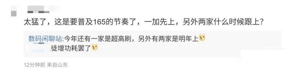 在該條微博下,與網(wǎng)友互動(dòng)時(shí),有網(wǎng)友提問稱,“太猛了,這是要普及165的節(jié)奏了,一加先上,另外兩家什么時(shí)候跟上?”,博主回復(fù)稱,“今年還有一家是超高刷,另外有兩家是明年上”;另一名用戶則表示,“還要啥充電寶”,博主則回復(fù)道:“Turbo續(xù)航會(huì)干翻充電寶”。由此來看,該系列新機(jī)的續(xù)航還是相當(dāng)值得期待的。