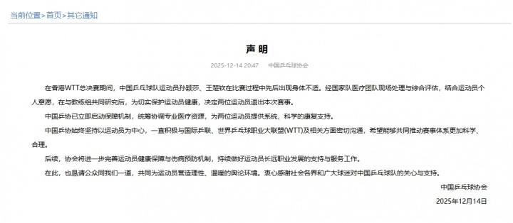 中國乒協在晚上發布聲明,已立即啟動保障機制,統籌協調專業醫療資源,為孫穎莎、王楚欽提供系統、科學的康復支持,將進一步完善傷病預防機制,做好運動員長遠職業發展的支持與服務。不過球迷對于這份官方聲明并不感興趣,不少人希望公布一些兩人的傷情,NBA明星球員因傷休戰,都會有個傷情報告公示出來,而乒協這份聲明,太過于官方,不知道兩人到底是什么情況。要知道以前樊振東高燒,張繼科韌帶撕裂都要在場上繼續打,以前的優秀選手是真的拿命拼。