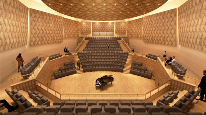 龍崗國際藝術中心音樂廳為設有305座的中心式舞臺,觀眾席環繞表演區域,這種觀演形式可以更好地促進演員與觀眾的交流互動,音樂廳聲場經專業設計,尤其適合小型的室內樂或古典樂獨奏。