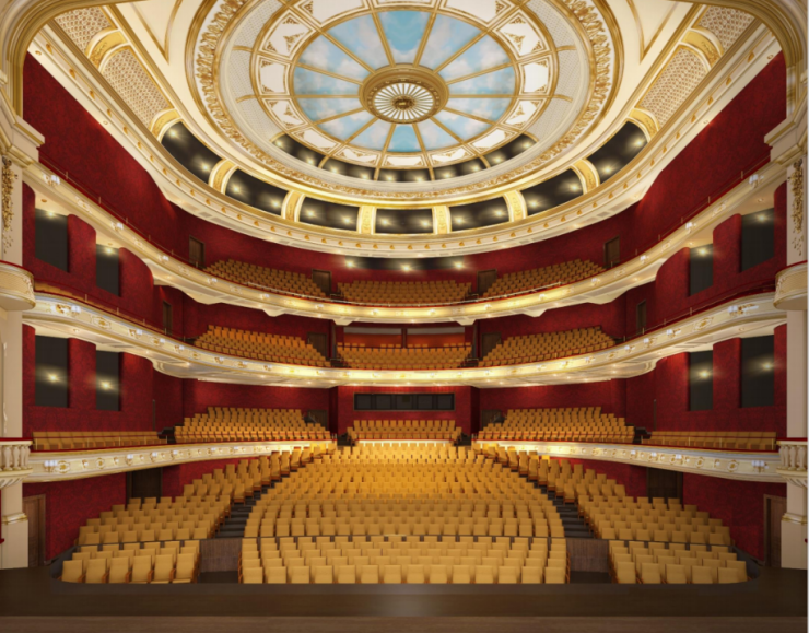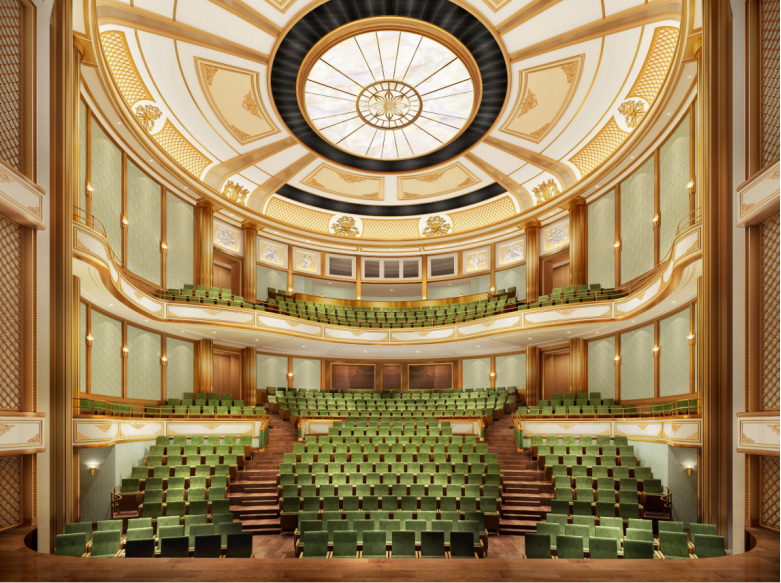 龍崗國際藝術中心戲劇廳采用鏡框式舞臺,配置鼓筒轉臺(內置升降臺)與臺口前樂池升降臺;平面布置為主舞臺 + 左側臺 + 右側臺的三向組織,建筑臺口寬12米、高9米,主舞臺深19.4米、寬29米,滿足戲劇、舞劇、小編制交響/合唱及綜藝晚會等多類型演出對快速轉場與復合景別的需求。