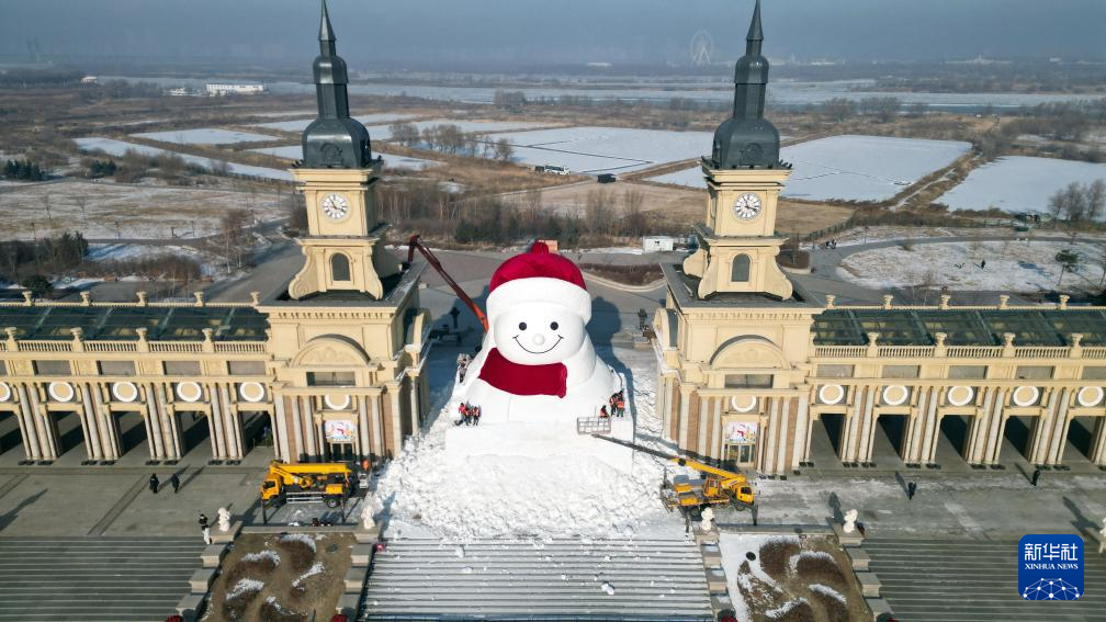12月14日拍攝的建設中的哈爾濱市群力音樂公園網紅大雪人(無人機照片)。