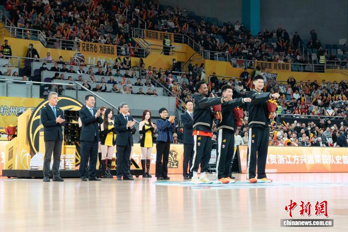 12月12日,2025-2026賽季中國男子籃球職業聯賽(CBA)常規賽揭幕戰在浙江杭州舉行,賽前舉行了上賽季頒獎儀式。圖為布朗(前左)、孫銘徽(前中)、胡金秋展示總冠軍戒指。中新社記者 吳君毅 攝