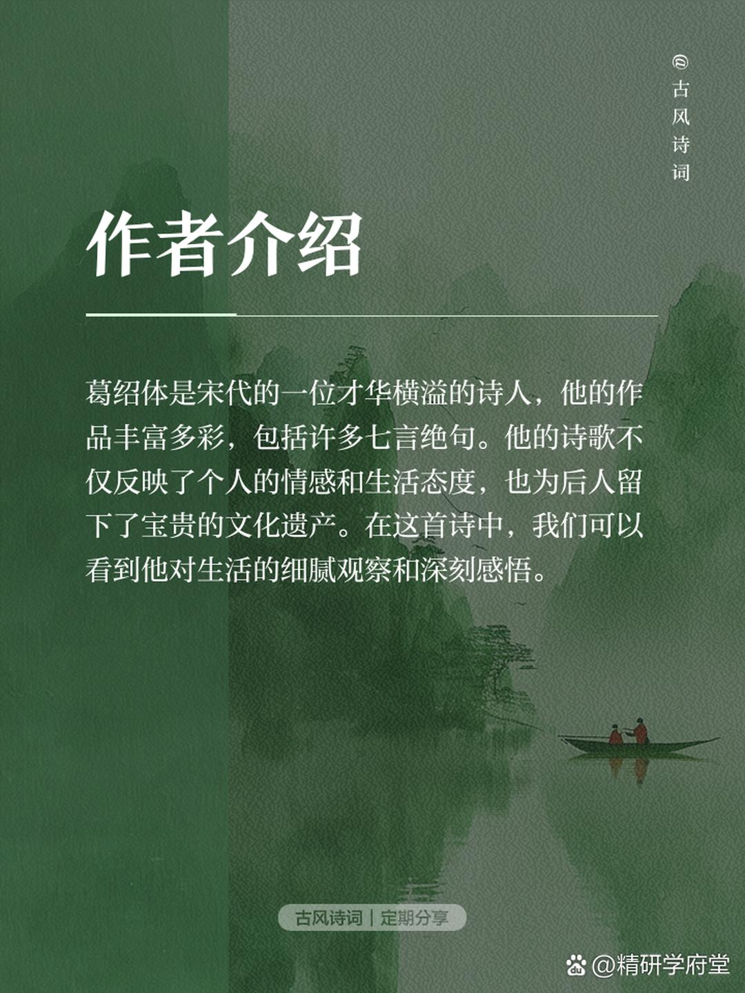 在此良辰美景、賞心樂事之中,葛紹體的筆觸并未流向狂喜,而是流露出宋人特有的含蓄與深沉慨嘆:“莫嫌風景堪惆悵,且伴琴尊慰客愁。” 他直言這美好景致亦能引發人生短暫的“惆悵”,但這并非沉溺,而是清醒的認知。正因為領悟到“風景”與“惆悵”常相伴生,詩人的選擇——“且伴琴尊慰客愁”——才顯得格外通透與主動。