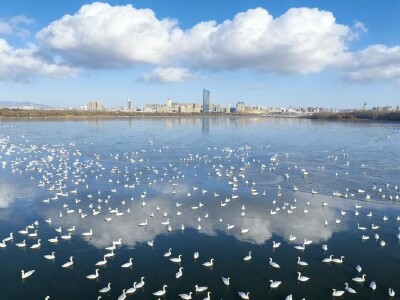 晨霧還未散盡,天鵝湖便浸在一片朦朧的銀白中。遠遠望去,數百只大天鵝舒展著潔白的羽翼,或在湖面劃出粼粼波紋,或曲頸梳理羽毛,橘紅色的喙在晨光里泛著溫潤的光。岸邊的蘆葦叢隨風輕搖,蘆花如雪般飄落在水面,與天鵝的白羽相映成趣,構成一幅流動的冬日畫卷。