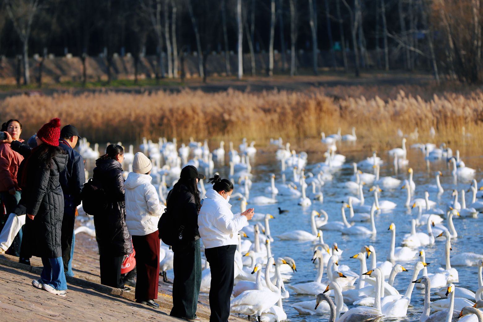 臨近正午,霧氣漸散,陽光灑在湖面上,波光粼粼。天鵝們時而群聚嬉戲,時而獨自游弋,長長的脖頸彎曲成優美的弧線。岸邊的觀景臺上,游客們紛紛舉起手機記錄這美好的瞬間,低聲交流著對天鵝的喜愛與對這片濕地的贊嘆。偶爾有天鵝發出清脆的鳴叫,劃破天際,為這靜謐的冬日增添了幾分靈動。