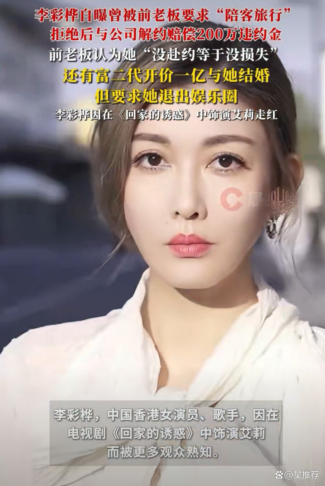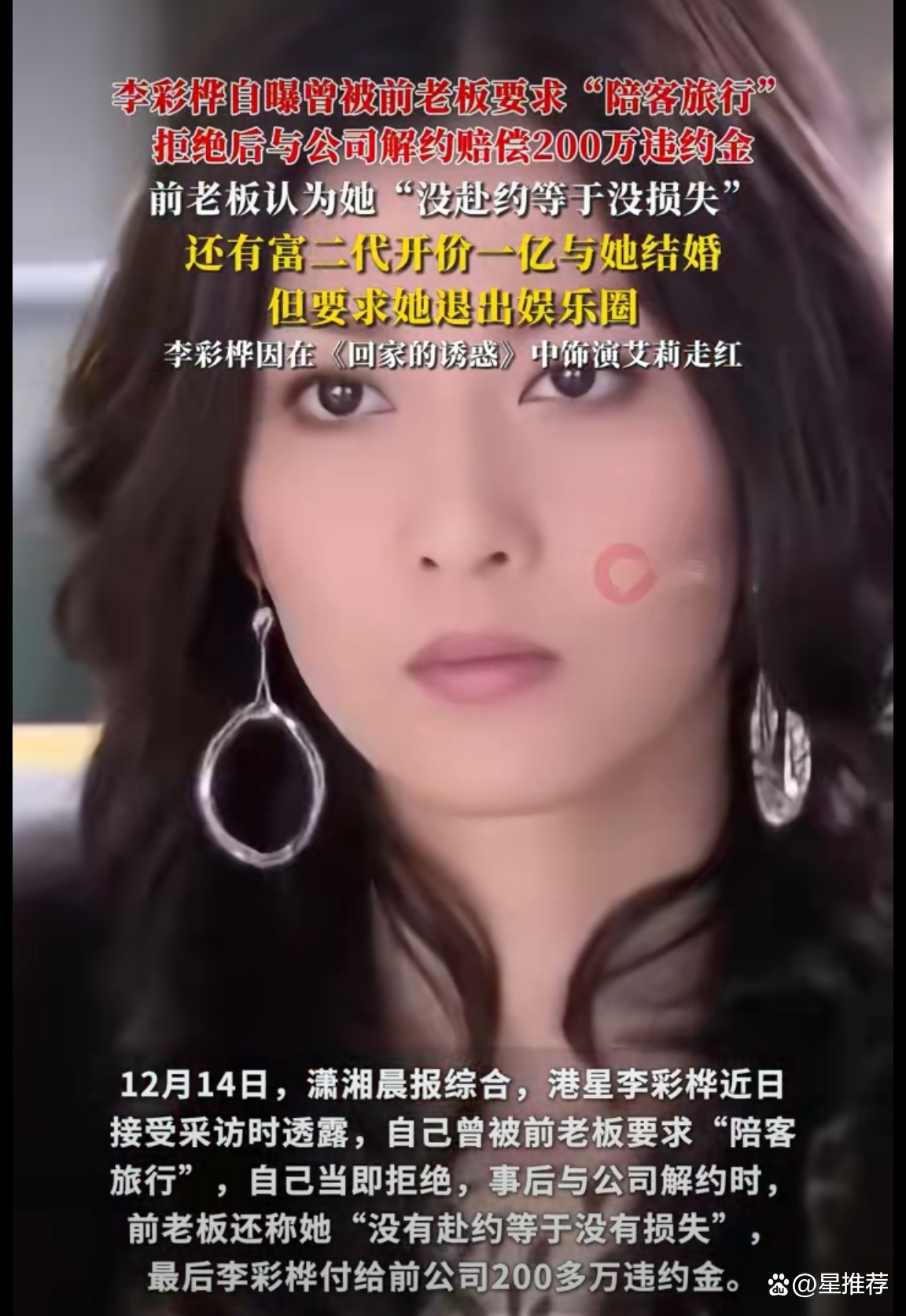 港星李彩樺近日在采訪中自曝兩次拒絕經(jīng)歷,斷然回絕前老板的陪客旅行要求,并賠上200萬(wàn)違約金,以及婉拒富二代一億結(jié)婚合約,瞬間引爆網(wǎng)絡(luò)對(duì)其職場(chǎng)遭遇和人生選擇的討論。