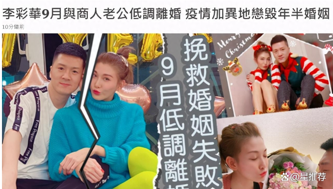 2019年,李彩樺與內(nèi)地富商黃彥書閃婚,但婚姻僅維持了一年多,于2020年9月離婚,離婚原因是黃彥書公司破產(chǎn),債務(wù)纏身,兩人聚少離多感情破裂。