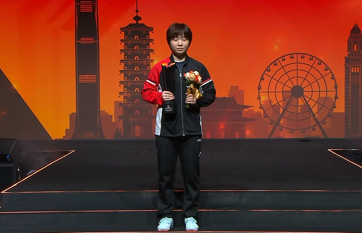 奪得女單冠軍的王曼昱最后登臺領獎。她舉著獎杯和鮮花,臉上露出了微微的笑容。
