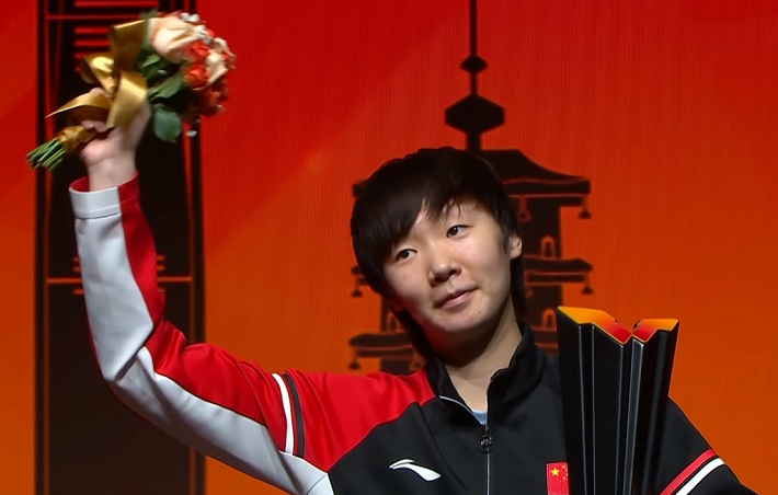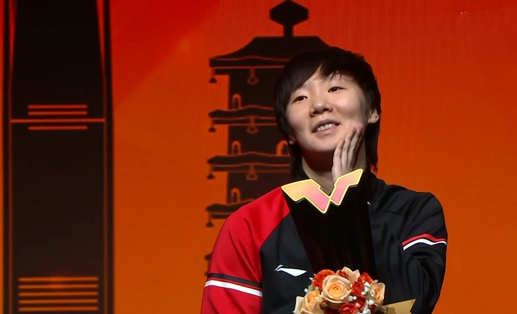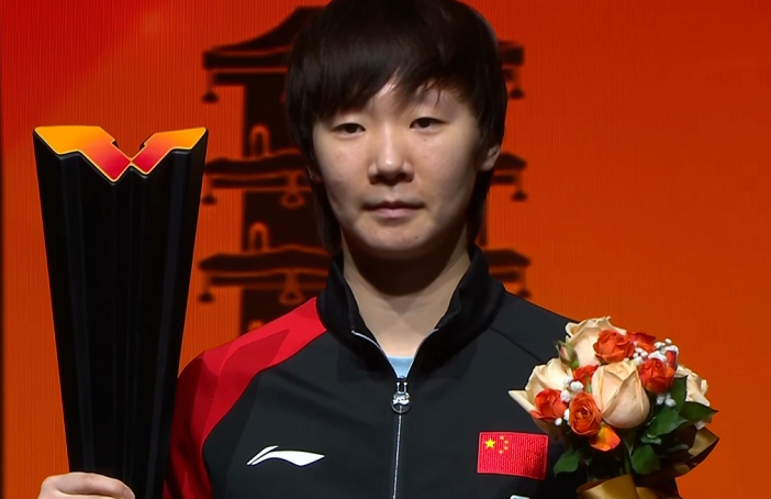 獲得女單亞軍的蒯曼首先登臺領獎。看得出她也不太開心。估計她也很渴望奪冠吧。最后她未能實現,自然會有點失落。