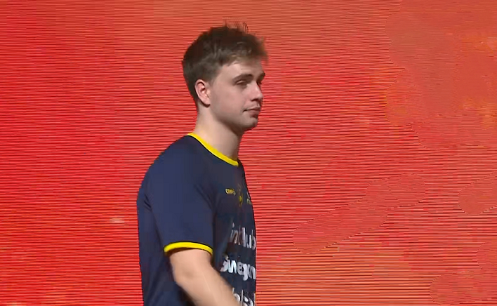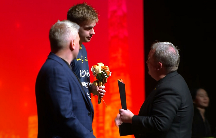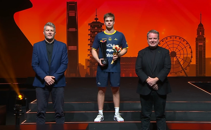 首先給男乒隊員頒發獎品。男單亞軍莫雷加德首先登臺領獎。在決賽中失利后,莫雷加德就很郁悶,露出了失落的表情。莫雷加德上臺領獎時,還沒有從失利中走出來,明顯很不開心。他對這個冠軍很渴望。可惜他最后輸了,無緣奪冠。