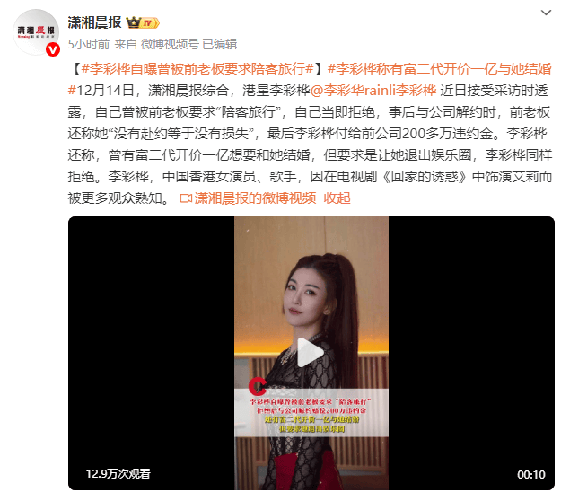 12月14日,瀟湘晨報綜合,港星李彩樺近日接受采訪時透露,自己曾被前老板要求“陪客旅行”,自己當即拒絕,事后與公司解約時,前老板還稱她“沒有赴約等于沒有損失”,最后李彩樺付給前公司200多萬違約金。