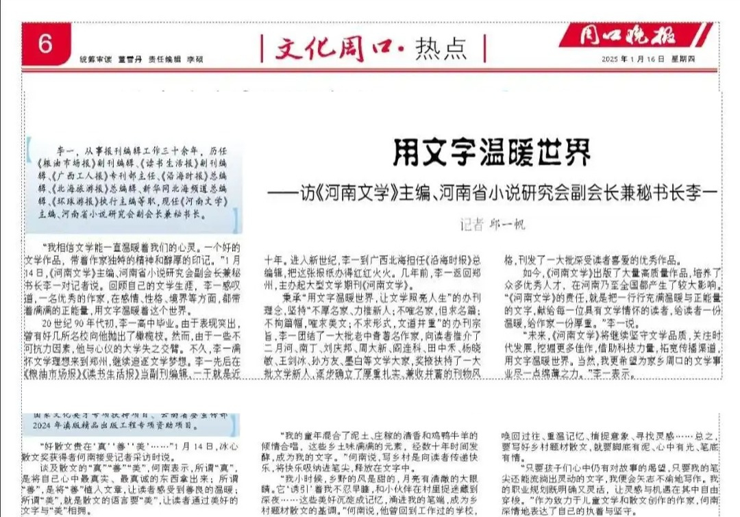 王培靜、梁有勞的軍旅小說,訴說著邊關軍人的風霜與對祖國的赤誠,字里行間皆是山河壯闊;張富存、宋守業筆下的中原村落,藏著農耕文明最后的溫情,一草一木皆含眷戀;朱群英、韓紅軍的生態散文,把人與自然的羈絆寫得觸目驚心,一字一句皆是叩問;張舟子、王友明的文學評論,在不計回報的堅守中推介著平民作者的心血之作,一筆一畫皆是熱忱……我始終堅信,真正的文學力量,從不在象牙塔的精雕細琢里,而在未經雕琢的真誠之中。這份真誠,讓《河南文學》在時代浪潮中穩穩扎根,也讓我們扛起了“用文字溫暖世界”的擔當,踐行了“不唯名家,但求名篇;不拘篇幅,唯求美文;不唯形式,文道并重”的初心——這從不是振臂高呼的口號,而是俯身拾撿每一粒散落在神州大地上的文字火種,讓它們得以燎原。