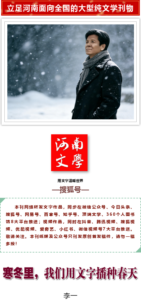 而我,早已不復當年的意氣風發。褪去輕狂,多了幾分煙火俗世的堅韌與沉穩。終于明白,人生最難得的,從不是一往無前的灑脫,而是在風雨飄搖中,守住半分當年對文學的赤誠與敬畏——就如《河南文學》始終堅守的那般,不隨波逐流,不辜負文字的重量,不虧欠每一份滾燙的熱愛。哪怕雪落滿身,寒意浸骨,也要在寒冬里埋下春天的種子,靜待花開。
