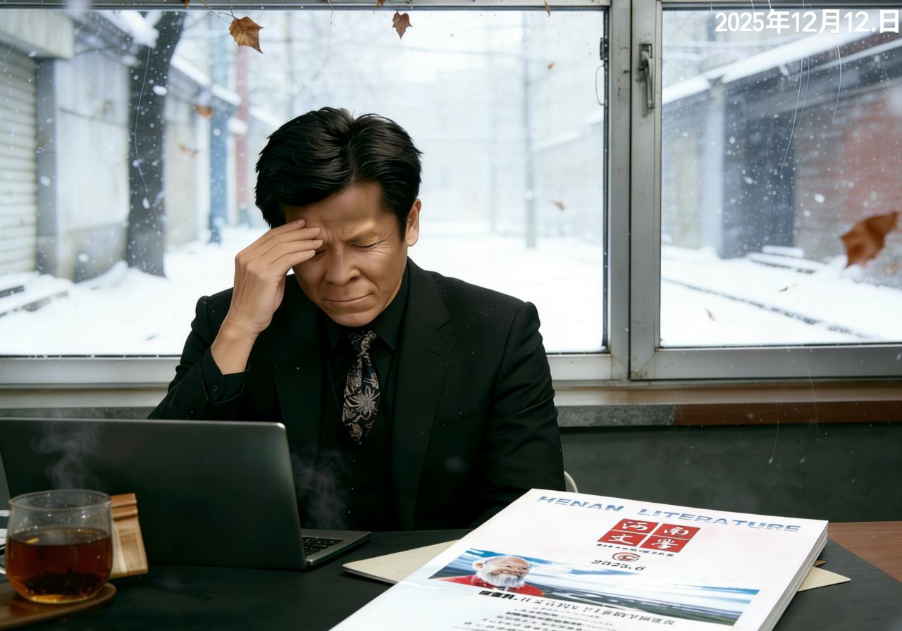 2025年12月12日,鄭州的第一場大雪漫過街巷,給鋼筋水泥的城郭暈染出幾分蒼茫詩意。朔風卷著枯葉,嗚咽著撲打塑鋼窗,涼意從窗縫悄然滲入,在桌角涼透的普洱上凝起一層薄汽,如霧似紗。案頭攤著剛校完的2025年最后一期刊樣,雪絲仍在天地間纏綿。我揉了揉發澀的眼睛小憩,恍惚間,竟跌回2018年冬創刊前的那個寒夜——自家客廳里,暖氣片滋滋吐著微弱的暖,我們幾人擁擠在茶幾周遭,桌上四碟小菜、兩瓶紅星二鍋頭,暈開朦朧的光。窗外,亦是這般呼嘯的寒風,仿佛要將這份不合時宜的文學執念,連根拔起,吹散在寒冬的夜色里。