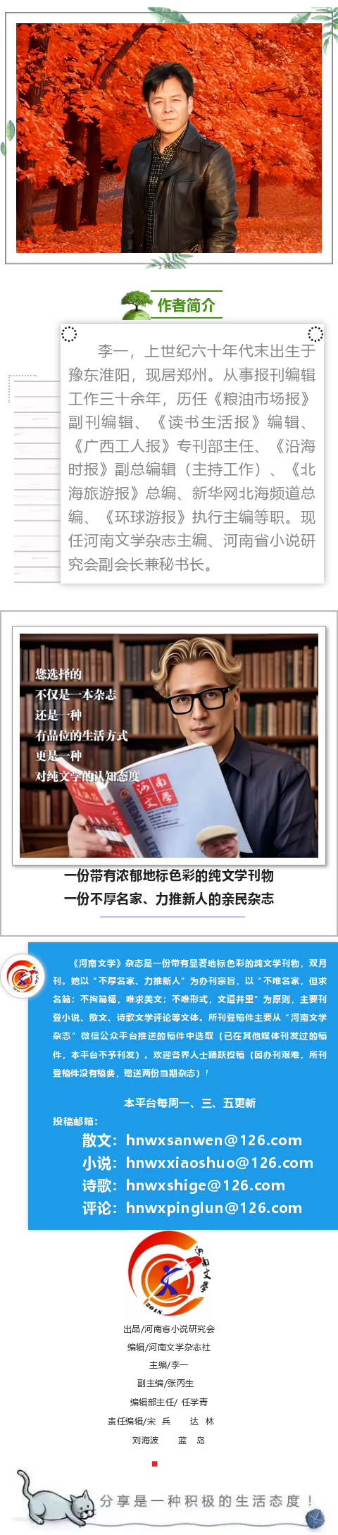 曾經的我,帶著幾分青年的灑脫與輕狂,總覺歲月綿長、前路坦蕩,敢與命運對酌,敢為熱愛赴湯蹈火。身為《河南文學》主編,我始終篤信“用文字溫暖世界”的初心,堅信文學自有穿越風雨的力量。秉持“不厚名家、力推新人,不唯名篇、但求真誠”的宗旨,只想為中華沃土上的文學夢想,留存一塊不染塵囂的凈土。
